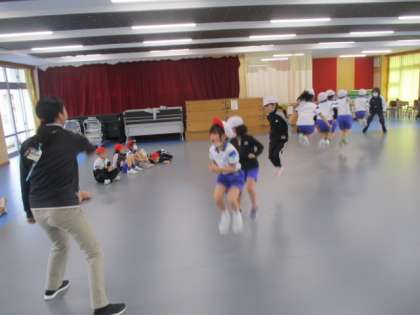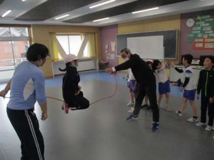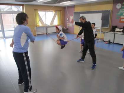 3時間目の1・2年生は、みんなの広場に集まり合同で縄跳びに取り組みました。写真は、ダブルダッチと長縄をしているところです。