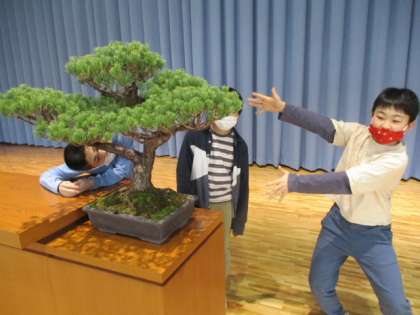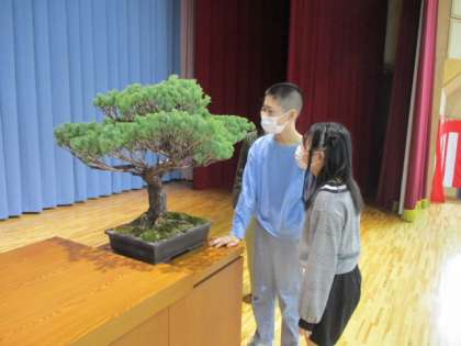 4時間目の修了式を前に、6年生が卒業式の準備が進んだ体育館に入ってきました。そして見事な松を見て喜んでいました。