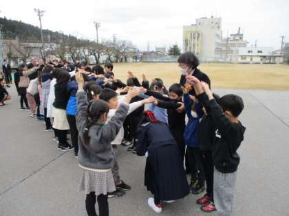 在校生が作ったアーチを通って6年生がお別れです。しかしその後、グラウンドを周り玄関前で「はい、ポーズ」