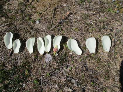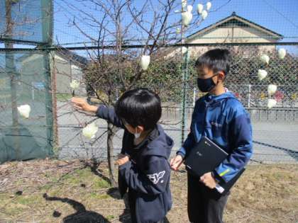 3名の児童が、前の記事でお伝えした「ハモクレン」の観察を行いました。そもそも本当にこの木がハモクレンなのかという疑問もありますので、花がもったいないような気もしますが1つを分解してみました。ハモクレンとこぶしが似ているようで、その違いは花びらの開き方や数だそうで、前者が9枚で後者が6枚だそうです。写真にあるように、分解した花の花びらは9枚で、間違いなくハモクレンでした。クロームブックを使って、この記録はしっかりと撮っておきました。