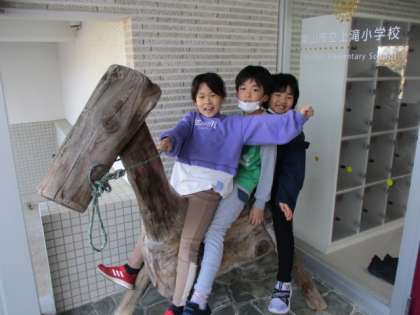 今朝も2年生は元気でした。登校するとランドセルを教室に置き、玄関前に出てきて鬼ごっこの開始です。しばらくするとお気に入りの木馬(通称、「上丸」)へ乗馬です。