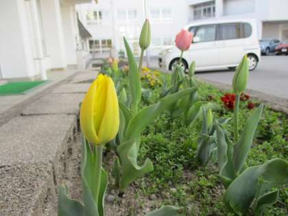 ピンクの花から1日遅れで、3年生と4年生の花壇に黄色いチューリップが咲きました。