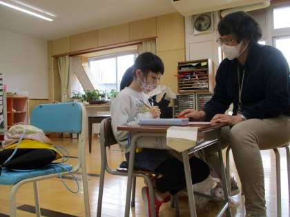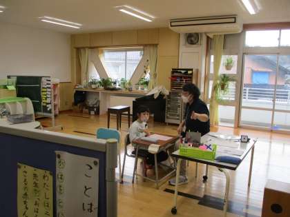 ひまわり級では、担任の先生と春休みの過ごし方や始業式の持ち物などを確認していました。ひまわり級は2階へ引っ越しました。お日様の光がよく入る明るい教室です。