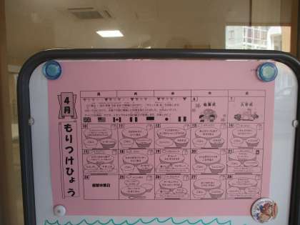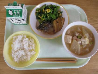 昨日から給食がスタートしています。今日の献立は、「ごはん、牛乳、さばの味噌煮、コーンあえ、鶏肉と大根のごますきに」です。毎日の献立表は、各ご家庭に配付してありますので、ご確認ください。