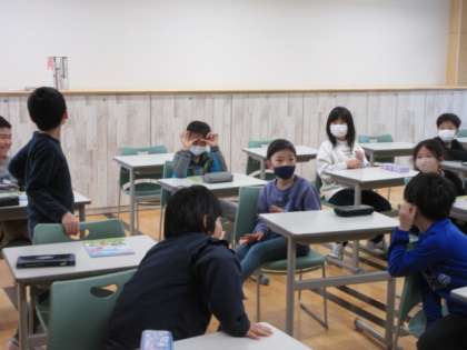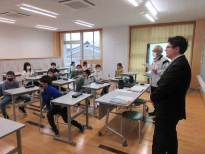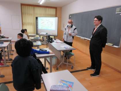 4月12日(水)初めての外国語学習(3年生) 公開日 2023/04/12 更新日 2023/04/12 3年生 外国語学習が今日から始まりました。 3階の外国語学習の部屋へ行き、緊張して座っています。 担当のハワード・ルーク・ロビショー先生と橋本孝弘先生に自己紹介をお願いされ、名前と、好きなものを言います。 もちろんまだ「日本語でいいよ。」と。