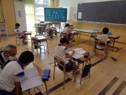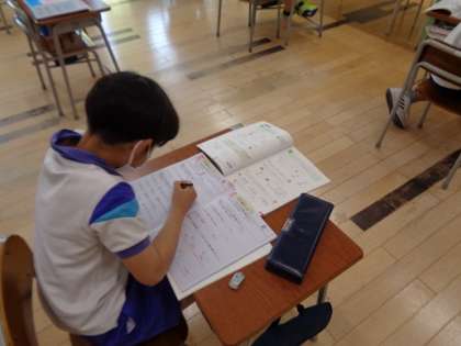 4年生の2時間目は算数の授業でした。教科書の問題やドリルの問題を各自進めていきます。先生から丸をもらった児童はとても嬉しそうでした。