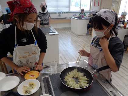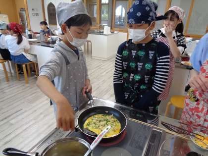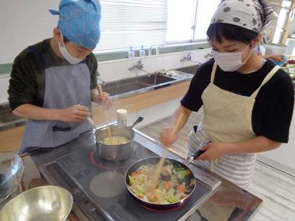 今日の家庭科は調理実習でした。グループに分かれて考えた朝ご飯のメニューをつくります。どの班もグループで協力しながら手際よく進めていました。