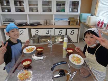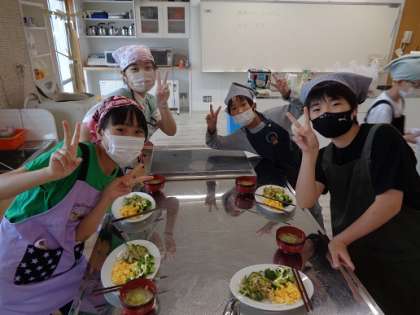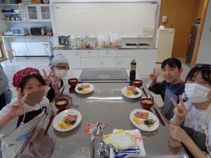 朝ご飯メニューが完成した様子です。自分たちでつくった朝ご飯、おいしさも倍です。みんな「おいしい」と言いながら満足気に食べていました。「食べて!」と先生たちにも快く分けてくれました。とても美味しかったです。