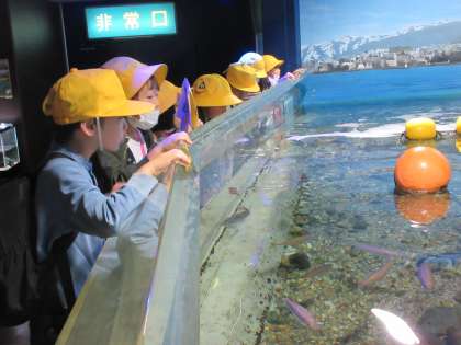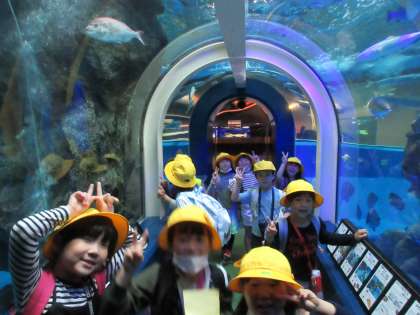 子供たちが楽しみにしていた校外学習です。まずは、魚津水族館に行きました。いろいろな水槽があり、動く魚を間近で観ることができて、子供たちはとても興奮していました。一番は、富山湾大水槽で、何度も海中トンネルをくぐっていました。