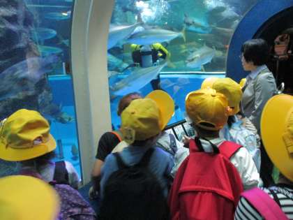 今日は1年生と校外学習で、魚津水族館とミラージュランドに行ってきました。魚津水族館では、様々な種類の生き物と出会い、子供たちは目を輝かせていました。「おさかなショー」と魚たちの「お食事タイム」も見ることができました。