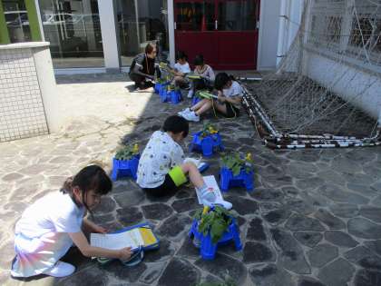週明けの月曜日、子供たちは今週も元気です。1年生は、朝顔の観察日記をかいています。2年生は、新しい漢字の学習です。