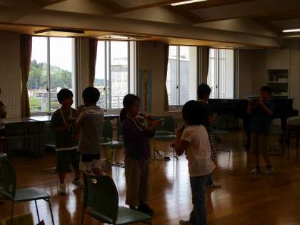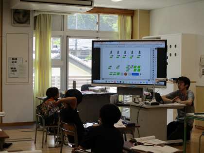 3年生は、ペアになってリコーダーでリズムを伝え合っています。4年生は、わり算の問題をデジタル教科書を使って学習しています。