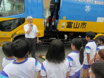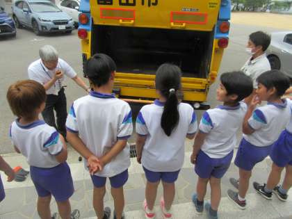 「3R」という言葉の意味を教えてもらった後に、リサイクル製品を見せてもらいました。子供たちはペットボトルをリサイクルして作られている服や蛍光灯をリサイクルしてできている表札に驚いていました。その後、ゴミ収集車がどのようにゴミを収集しているのか近くで見学しました。普段見ることができない様子を見学することができました。