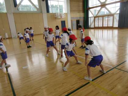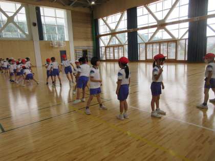 今日の3時間目は、1、2年生合同の体育でした。シャトルランをした後、反復横跳びの練習をしました。1年生は反復横跳びがはじめてだったので、1年生と2年生がペアになり、向かい合って「わたしの動きをまねしてね」と、跳び方を教えてあげていました。次の体育の時間では、よい記録が出せるでしょうか。