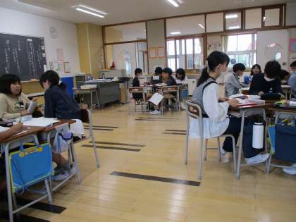 聞き手、話し手、記録者の役割を意識して、グループでインタビューを行っています。話し手に応じて、好きなことなどの質問内容が工夫されていました。決められた手順に沿ってやってみる活動ですが、和やかな雰囲気。こうした学習も、コミュニケーション能力の一つの技になるのですね。