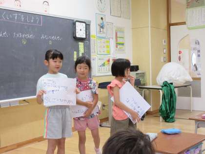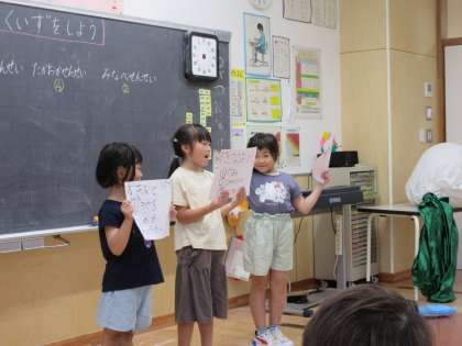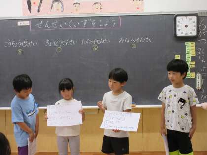 生活科の時間に「先生クイズ」をしました。学校探検で先生方にインタビューしたことをまとめて、クイズをつくり出し合いました。先生方の好きな物と仕事についてのクイズや紹介でした。