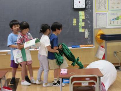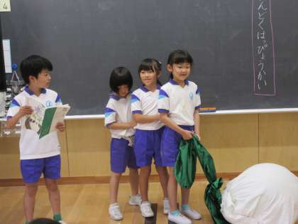 国語の時間に「おおきなかぶ」の音読発表会をしました。3つのチームに分かれて、役割読みや場面読み等、チームで読み方を相談して練習しました。それぞれのチームで読み方にも工夫があり、読み方のバリエーションが増え、音読の楽しさが増えたと思います。