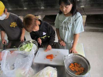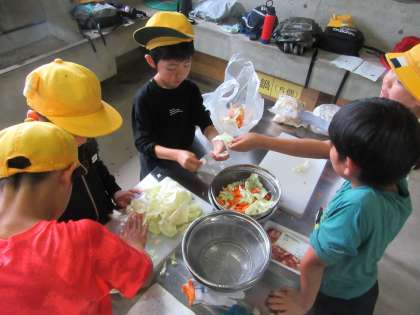 野外炊飯は焼きそば作りをしました。みんなで協力して野菜を切ったり洗ったりしています。