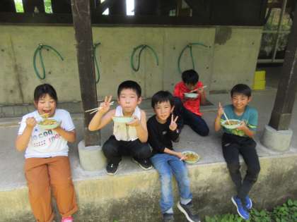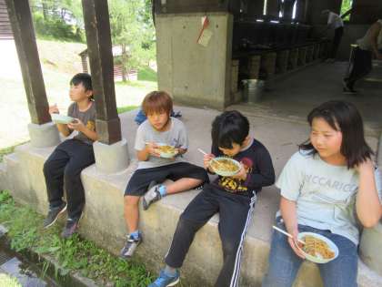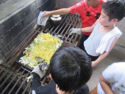 完成した焼きそばはどちらのグループもおいしかったようです。何回もおかわりしたり、お互いの焼きそばを食べ比べしたりしていました。
