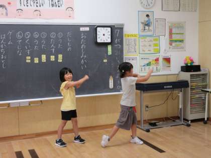 1学期は後1日です。今日は、みんなで「お楽しみ会」を開きました。歌、ダンス、クイズとチームに分かれて出し物を出し合いました。初めての「お楽しみ会」ですが、自分たちのやりたいことを決めてしました。最後は、みんなで「ハンカチ落とし」をしました。