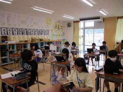 6年生は、社会。平安時代のファッションを調査中です。一人で、ペアで、グループで、自分に合ったスタイルで取り組んでいます。