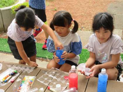 昨日の図工の時間に「カラフルいろみず」をしました。ペットボトルでつくった色水を友達の色水と混ぜると、素敵な色水ができあがりました。たくさんの友達と色水を交換することで、カラフルな色水になりました。