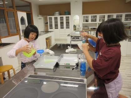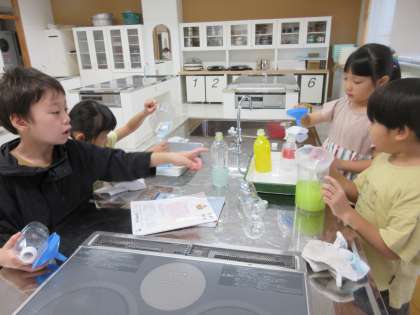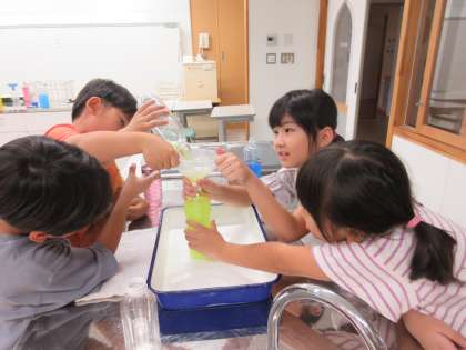 算数「どちらがおおい」の学習です。2種類のペットボトルで、どちらが多く入るかを比べました。どういう方法で比べたらいいのかを考え、もっと大きな入れ物に移して比べること、一方に入れて溢れるかどうかで比べること等、いろいろやってみました。