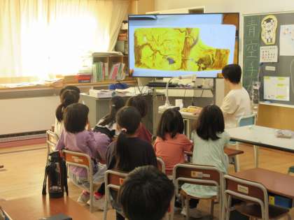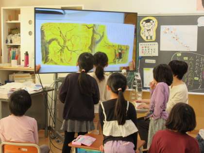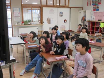 10月4日(水)「お話会」(1年生) 公開日 2023/10/04 更新日 2023/10/04 1年生 今日は、月1回の「お話会」の日でした。「もりのかくれんぼう」というお話でした。森の中に動物たちが隠れています。子供たちは、主人公のように絵本の森の中で必死に動物を探しながら、物語の世界に引き込まれているようでした。