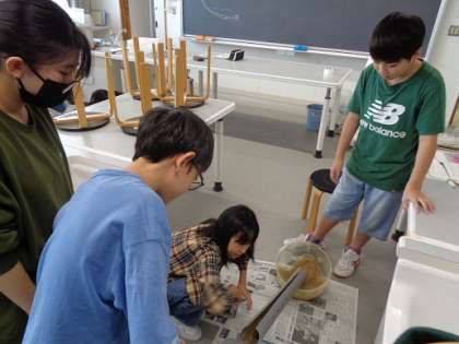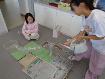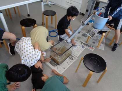 地層はどのようにしてできるのかを調べるために、川と海に見立てた実験装置をグループごとに考えてきた6年生。今日はいよいよ実験の日でした。流れた砂や泥が積もっていく様子を観察し、地層のでき方について考えました。