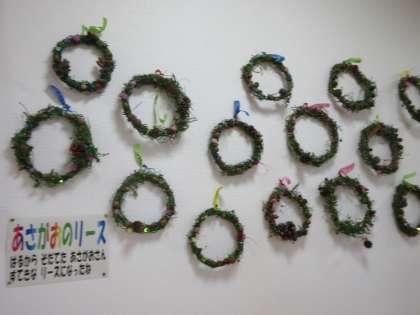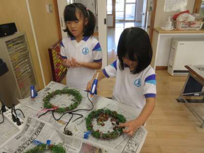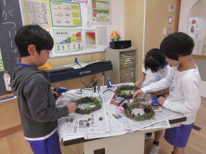 春から大切に育てていた朝顔のつるを使って、秋のリースを作りました。初めてグルーガンを使ったので、どきどきの子供たちでしたが、2回目は、使い方も慣れてきたようで楽しんで作っていました。どのリースもとても素敵でした。持ち帰ったら、どこかに飾ってあげてくださいね。
