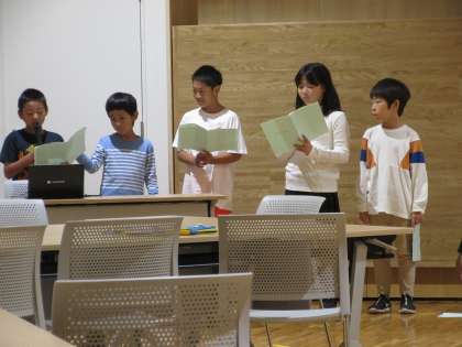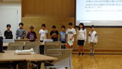 海洋ごみ問題について、今日は大山会館で同じ学習に取り組んだ柳町小学校の4年生と交流しました。まず始めに、自分たちが調べたことについてスライドを使って発表し合いました。前日には、休み時間を使っていろいろな先生から発表のアドバイスをもらい、よりよい発表にしました。今日の発表では、どの子も自信をもって発表していました。