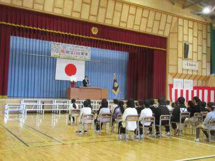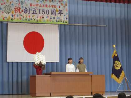 11月3日(金)、青空が広がる暖かな日となりました。上滝小学校創立150周年式典が行われ、実行委員長の式辞、ご来賓の方々の祝辞、記念品贈呈と続き、児童代表挨拶では、6年生が今日の喜びと上滝小の伝統を受け継ぐという頼もしい言葉が述べられました。