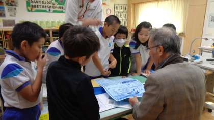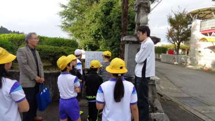 今日は、社会科のゲストティーチャーとして自治振興会長さんが来校してくださり、地域のお祭りや始水石についてお話していただきました。子供たちは「祭りで使う馬はどこから連れてきたのですか?」と質問したり、始水石についての案内板を読み、水を堀出すためには何メートルも土を掘ったのだと実感したりするなど、興味をもってお話を聞いていました。