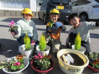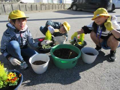 2時間目に講師の方をお招きし、寄せ植えを行いました。天候にも恵まれ、楽しみながら活動に取り組むことができました。最後には「花を植えるのが好きになりました」と感想を伝える子どもの様子が見られるほど、充実した時間になりました。