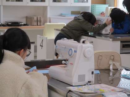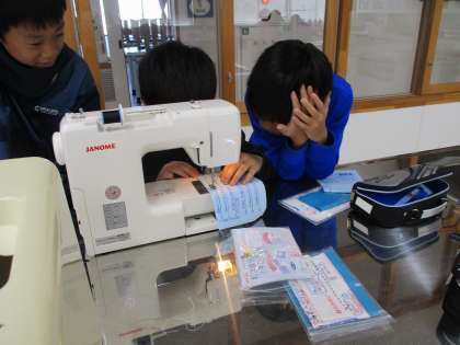 5年生は家庭科、ミシンの実習中でした。数人で一つのミシンを順番に使います。友だちがミシンを操作するときも、見守っている姿がほほえましいです。