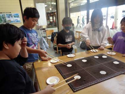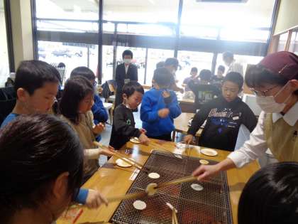 ささらや立山本店では、せんべい作りの工場見学をしました。機械でする仕事と、人の手ではないとできない仕事に分けられていました。おいしいおせんべいをたくさん作るために、たくさんの工夫がありました。みんなで手焼きせんべい体験をして、おいしく食べました。
