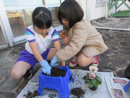 生活科の時間に、パンジーの苗とチューリップの球根を植えました。来年度の春に小学校の玄関を花で素敵にしようと、朝顔の鉢に植えました。球根の植え方、苗の植え方も勉強しました。植え終わった後は、玄関の掃除もばっちりしました。中には、バンジーの苗に名前を付けて、話しかけている子供もいて、微笑ましかったです。