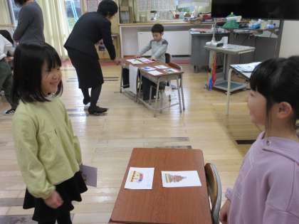 国語「ものの名まえ」の発展学習として「おみせやさんごっこ」をしました。洋服屋さん、車屋さん、文房具屋さん等、自分が開きたいお店(まとめた名前)と商品(それぞれの名前)を作りました。お客さんとして校長先生にも来ていただき、とても喜んでいました。来週は、2年生を招待する予定です。