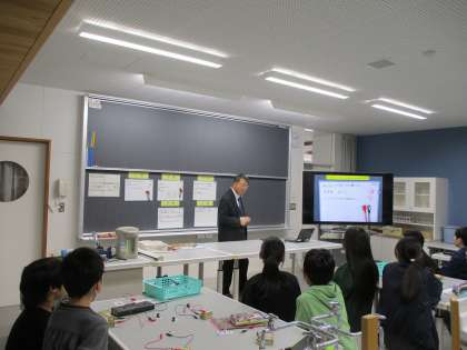 上滝中学校の理科の先生に来ていただき、中学校授業体験を行いました。LEDやモーター等の器具を使って電気回路をつくる実験を通して、電気のきまりを見付ける学習です。皆、試行錯誤しながら、いろいろなことを発見していました。そして、中学校の学習がとても楽しみになったようです。