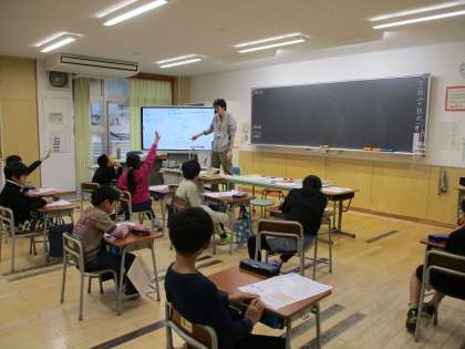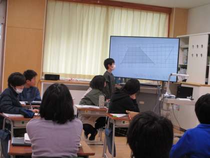 5年生は、算数で、台形の面積の求め方を発表していました。いろいろな考え方を出し合えるおもしろいところです。