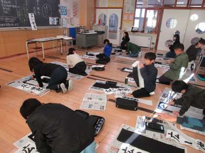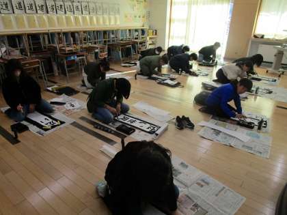 5年生は「広い世界」という字を書きました。子どもたちは、練習の成果を発揮しようと、とても集中していました。3学期への気持ちの高まりを感じました。3学期は、卒業を祝う活動が中心であり、6年生に今までの感謝を伝えられるように、また、学校のリーダーとして成長していけるようにがんばっていきます。5年生の今後の成長に期待です。
