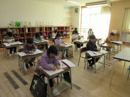 始業式が終わった後、1年生にとっては初めての「書き初め大会」がありました。みんな、張り切って「みらい」の文字を硬筆墨で書いていました。3文字だけですが、休み中の練習の成果を発揮できるようにがんばっていました。
