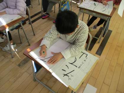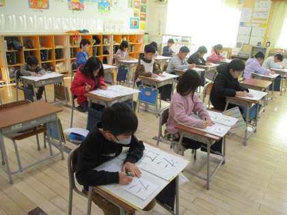 3学期に入り、元気に登校してきた2年生。始業式が終わった後、教室に戻って書き初め大会を行いました。お手本を指でなぞり、気を付けるところを確認してから本番に入る子、「失敗したけど、もう1枚は気を付けるぞ」と前向きに取り組む子など、一人一人が真剣に取り組んでいました。