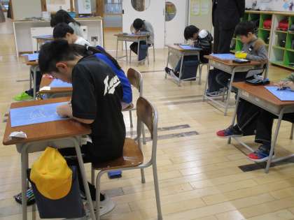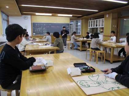 3年生、4年生ともに図工で、彫刻刀を使って版画に取り組んでいました。3年生は初めての彫刻刀なので、先生から持ち方や手の置き方等、丁寧に教わりながら進めていました。4年生は皆集中して黙々と彫り進めていました。