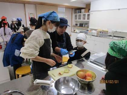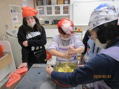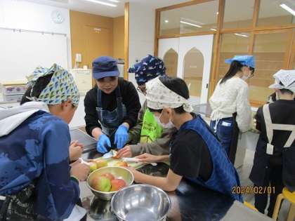 本日は、阿保美希さんをお迎えしジャム作りをしました。子供たちは、とても手際よくりんごを切ったり道具を片付けたりしていました。りんごの皮むきに苦戦している子供もいましたが、阿保さんに助言をもらい上達したようです。出来上がったジャムを食べると、子供たちは「おいしい!」「家でも作りたい!」と、とても満足そうでした。