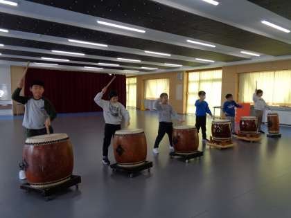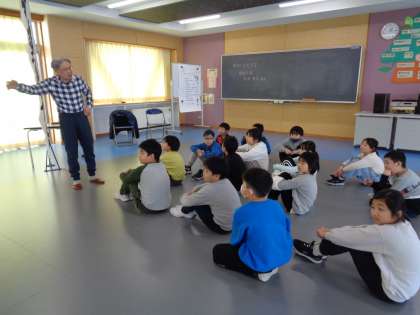 異世代交流学習で薬師太鼓について学びました。講師の野原先生から、薬師太鼓を始めたきっかけのお話を聞き、実際に太鼓をたたきました。ばちの持ち方や姿勢など教えてもらいました。もっともっとたたきたくなった子供たち。次回が楽しみです。