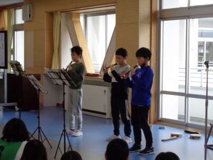 今朝のミュージックタイムに、3年生の3人が出演しました。リコーダーで演奏した曲は「パフ」です。朝の会から緊張した様子の3人。「今まで、自分から出ようとしたことがなかったから緊張するよ」と話していました。学習参観のときより上達していました。3人の美しいリコーダーの音は、2年生のあこがれにもなったのではないでしょうか。