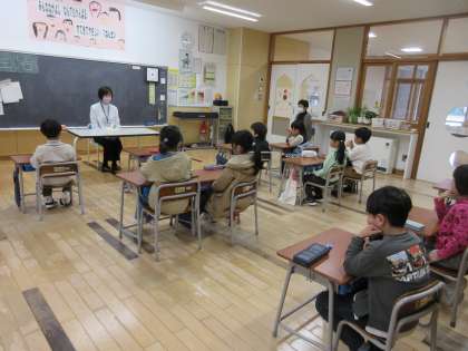 今日は、大山図書館の方が1年生のストーリーテリング(語りのみのお話)とブックトーク(一つのテーマに沿って、本の紹介をする)をしてくださいました。子供の知恵で魔物を退治する話と、2月22日の「猫の日」にちなんで猫がテーマのブックトークでした。子供たちは、真剣に聴いていました。
