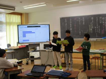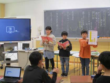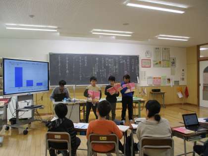 3月5日(火) 学習の様子 4年生 公開日 2024/03/05 更新日 2024/03/05 4年生 4年生は国語「調べて分かったことを話そう」の学習です。「休日は何時に起きるか」など生活の身近なことをアンケートして、グラフに表し、分かったことを発表していました。インタビューコーナーもあり、感想を言ってくれた人に、さらにインタビュアーが一言添えることもできていましたよ。