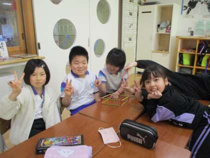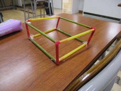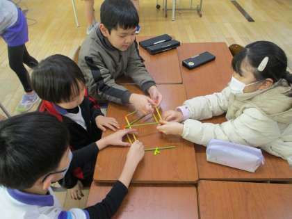 3月7日(木)はこの形をしらべよう(2年生) 公開日 2024/03/07 更新日 2024/03/07 2年生 2年生は算数で箱の形を学習しています。今日は、ストローとモールを使って、辺と頂点の数を調べました。最初は「モールはいくつ必要?」と話していた子供たちでしたが、「モールは上に4個と下に4個で、8個いるよ」と気付くと、班の友達と協力して、箱の形を作っていきました。完成したときは、「できた!」と嬉しそうでした。楽しみながら学習できた2年生でした。